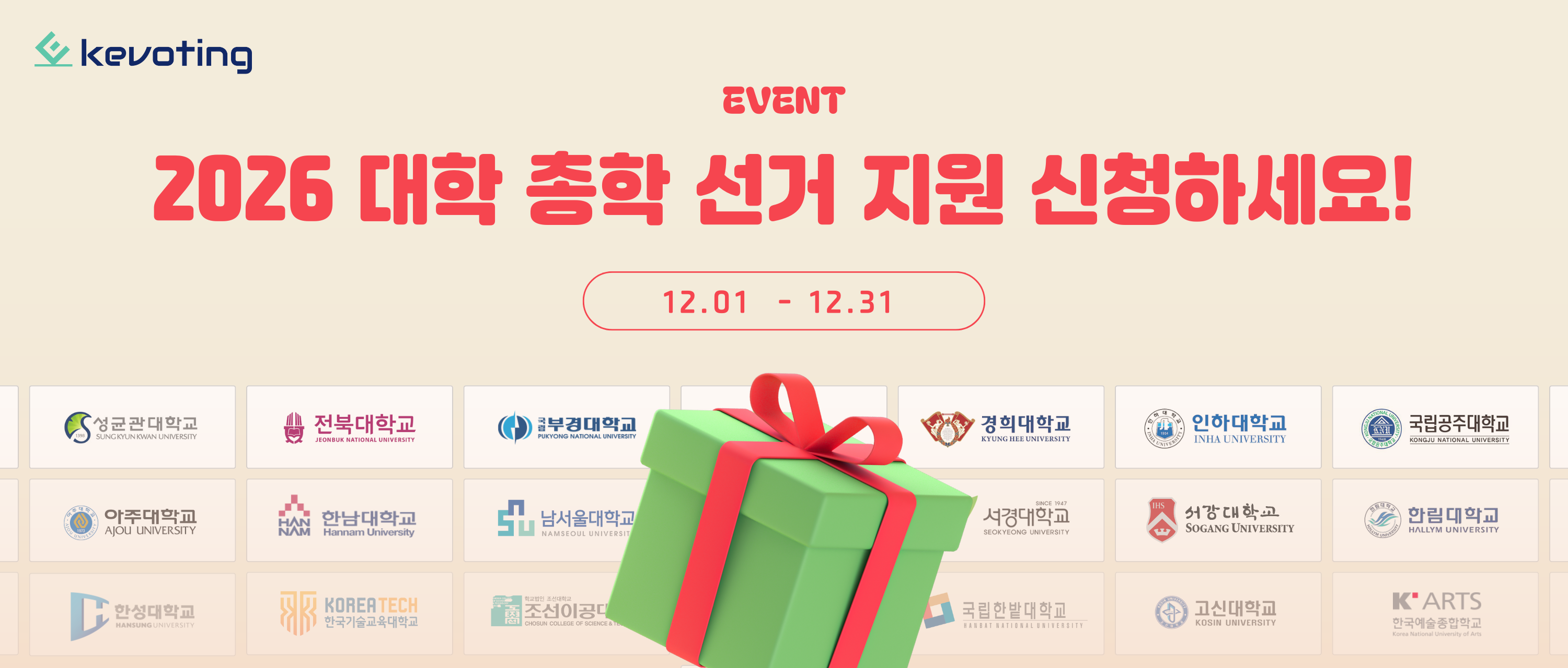 11월에도 많은 대학이 kevoting과 함께 안정적으로 선거를 마무리했습니다. 아직 선거 일정이 남아 있다면, 12월 31일까지 최대 50% 특별 할인 혜택을 신청하실 수 있습니다. 모바일·PC·현장투표를 모두 지원하는 올인원 시스템으로 투표율 걱정은 덜고 성공적인 선거를 운영해 보세요. ✨